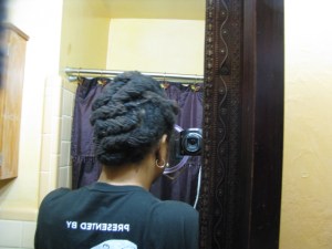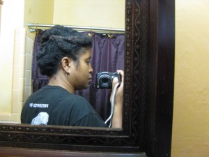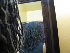 Now I’m not trying in any way to revive those days but what I have been doing the past couple of weeks is to use a tiny amount of my herbal coconut oil (I’ll do  post on this soon) to seal the moisture in after my daily spritzing with water.  I decided to do this because I don’t use conditioner on my locs and I my oil has conditioning herbs in it.  And it’ll be a pre treatment prior to my weekly washing.  So yeah, I’m multi-tasking on my hair.  Love that!! lol